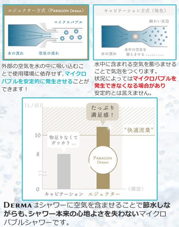 霧化和超細氣泡花灑,不能從其結構產生大量熱水,大大減少淋浴的暢快感和滿足感而失望。反之,Paragon Derma 是採用一種創新噴射系統技術,以注入外部空氣穩定產生微泡,讓你可以感受到大量微泡和源源不絕的熱水,帶給你舒適滿足的淋浴享受,卻又不失節水效果。