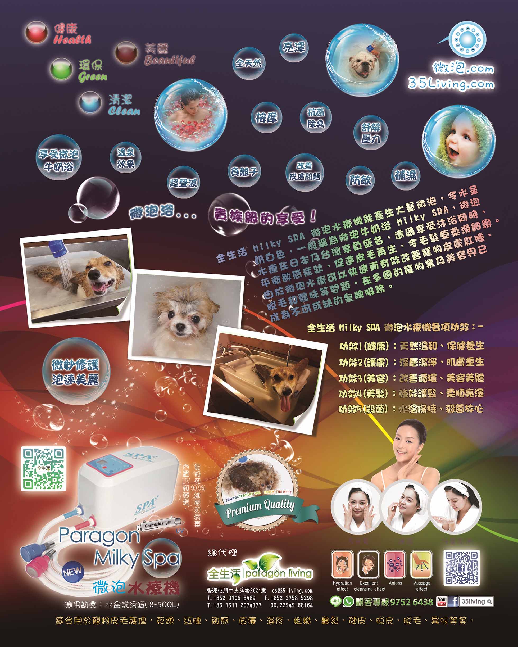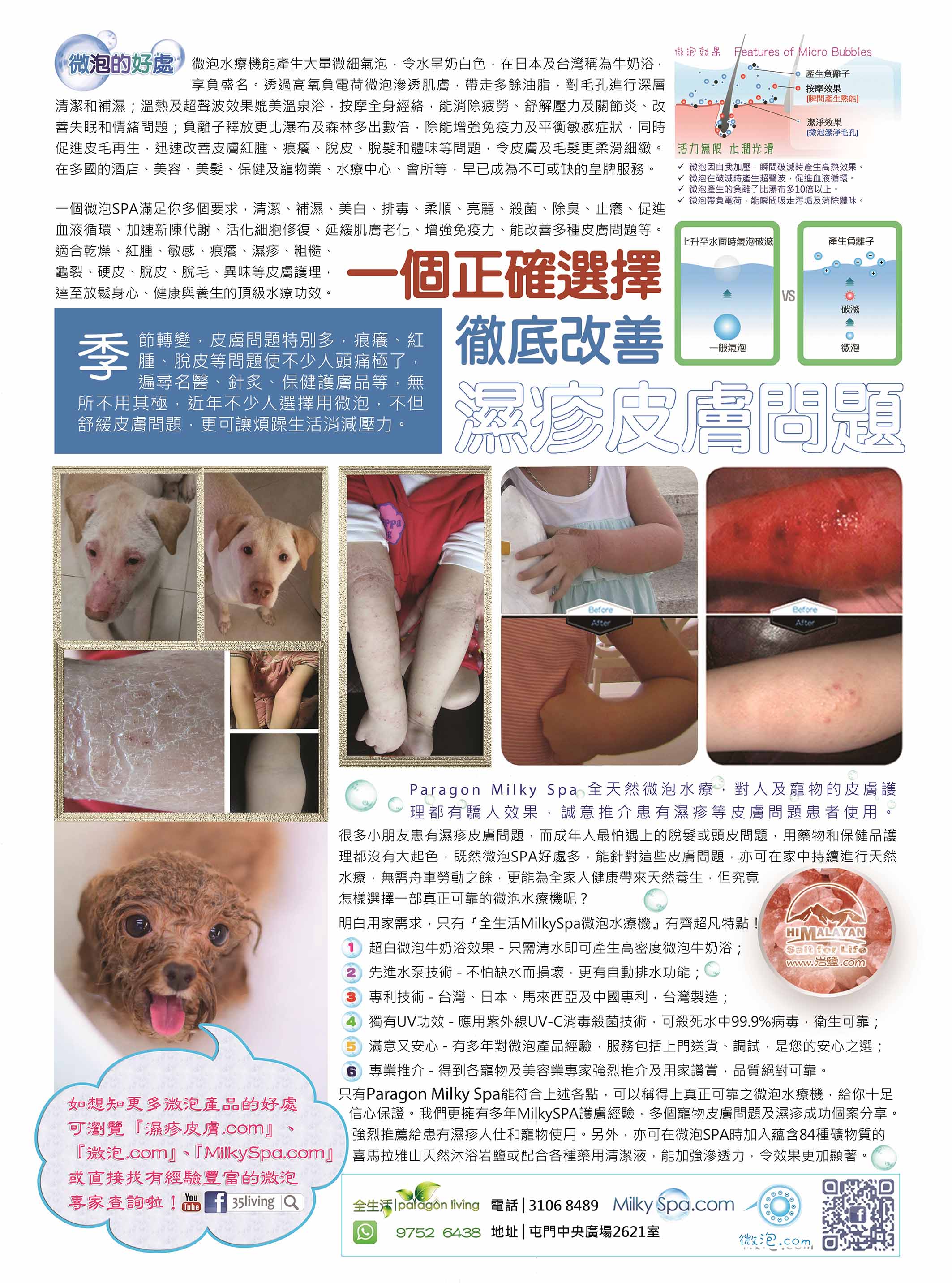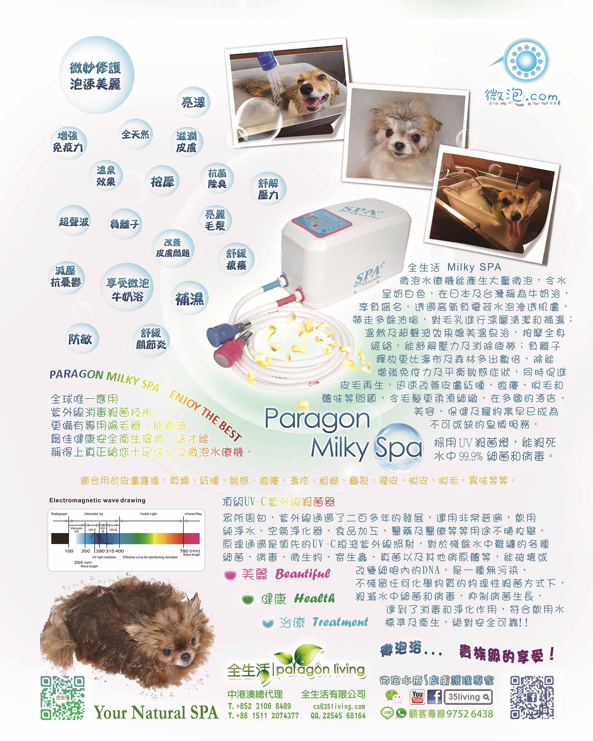 ?經過我們精準調校後,微泡效果會更好 ?沒有手動排水功能,停機後水泵就會存有積水問題 ?一般SPA機缺水就會無法開機,需要先慢慢人工入水 ?一般SPA機的水泵缺水就會損壞 ?微泡不夠細緻根本無法進入毛孔 ?毛髮或體味等會引起衞生問題 ?有寵物專用隔毛器就可被免毛髮吸入機內造成阻塞及衛生等問題 ?其他機發生問題時要送回原廠修理,非常浪費時間(有皮膚問題跟本天天都痛苦) ?我們內置UV-C紫外線絕對比使用臭氧健康、快速、安全、可靠 ?紫外線消毒是一種無污染、不殘留任何化學物質的物理性殺菌方式 ?紫外線應用已經過百多年發展,如淨水器、空氣淨化器、食品加工、醫藥及醫療等,非常普遍 ?我們已完全掌握微泡技術嘅分別 ?我們不乏真正用家的成功個案分享和不同的護膚經驗 ?我們早早已為您嚴選産品,因為我們亦是一個真正的用家 ?我們一早已立志要幫助濕疹皮膚患者 ?我們是真正的始早,更擁有相關中英文頂級域名 ~ 微泡.com / MilkySpa.com / 濕疹皮膚.com 等等 ?我們Facebook上可以找到多年來做微泡的專業和用家的滿意分享和支持 ?我們少做廣告推廣,以實力令更多人認識我們 ?如有任何問題或想知更多,歡迎您隨時致電:97526438查詢